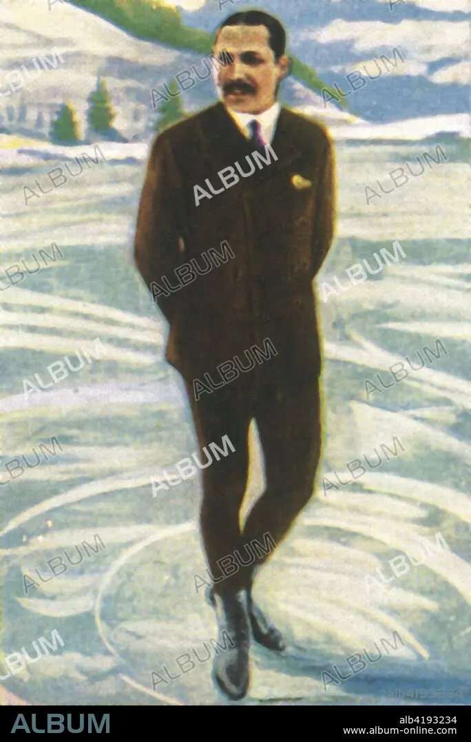 Austrian figure skater Willi Böckl, 1928. Willy Böckl (1893-1975) won the World Figure Skating Championships four times, and won silver medal at the 1928 Winter Olympics, held at St Moritz in Switzerland. From "Die Welt in Bildern", (The World in Pictures), cigarette card album, c1928. [Georg A Jasmatzi, A.-G., Dresden, Germany]