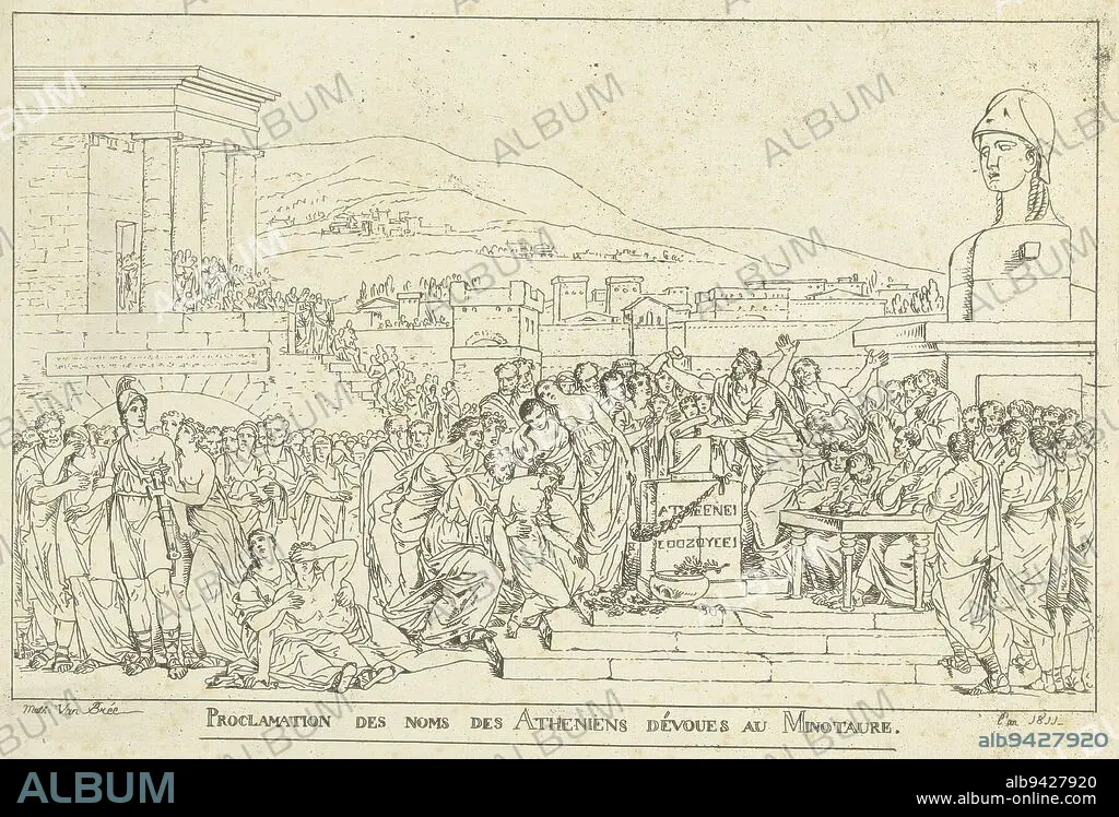 A large group of people are gathered in a large square in Athens On a rise is an urn from which the oracle determines the names of the Athenian youths to be sacrificed to the monster Minotaur On the left is the Greek hero Theseus who will eventually slay the monster and deliver the Athenians from its burden, The oracle determines the names of the youths to be sacrificed to Minotaur Proclamation des noms des Atheniens d, print maker: Mattheus Ignatius van Bree, (mentioned on object), Mattheus Ignatius van Bree, Antwerp, 1811, paper, etching, h 245 mm × w 325 mm.