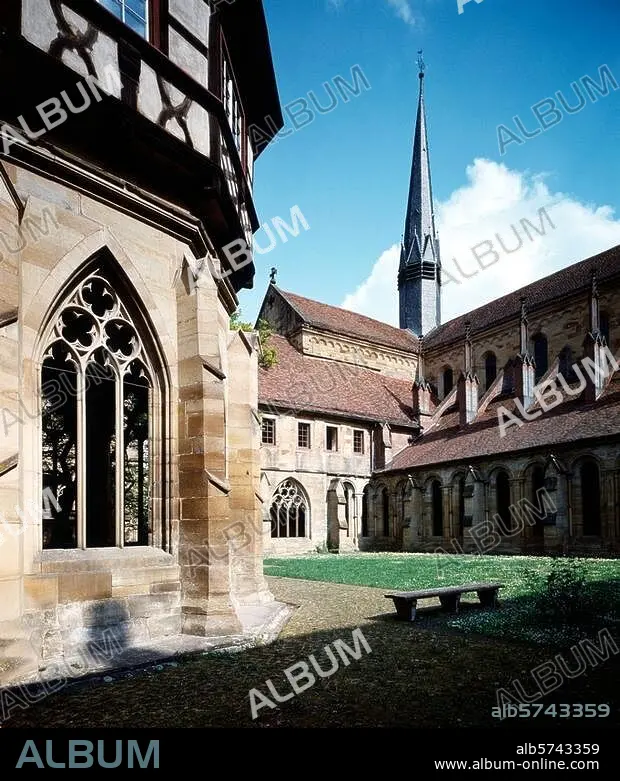 Maulbronn (Baden-Württemberg), ehem. Zisterzienserkloster. (gegründet 1147). Kreuzgang (13./14. Jh) mit Brunnenhaus (um 1350, Fachwerkaufbau 1511) und Klosterkirche (1178 geweiht). Foto.