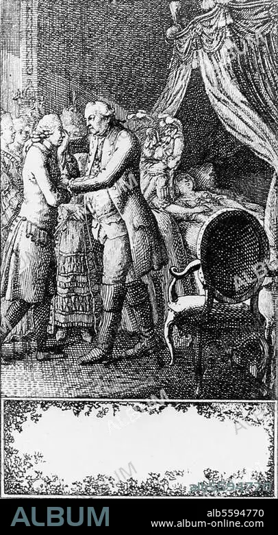 Hermes, Johann Timotheus; Schriftsteller; 1738-1821. Werke: Sophiens Reise von Memel nach Sachsen (1770/75). "Und wir Grausamen haben sie vom Sterbebette entfernt". (Ill. zu Bd. 5, Geschichte des Predigers Gros, S. 289). Radierung, 1776, von Daniel Chodowiecki (1726-1801). 9 × 4,9 cm.