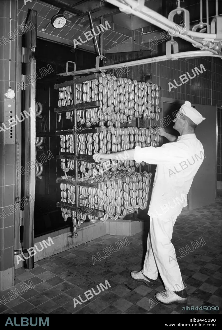 KF Kooperativa Förbundets charkuterifabrik i Malmö 1961.. Rökmästare Harry Sandberg tömmer en tornrök på prinskorv.. Foto: Sydsvenskan / IBL Bildbyrå