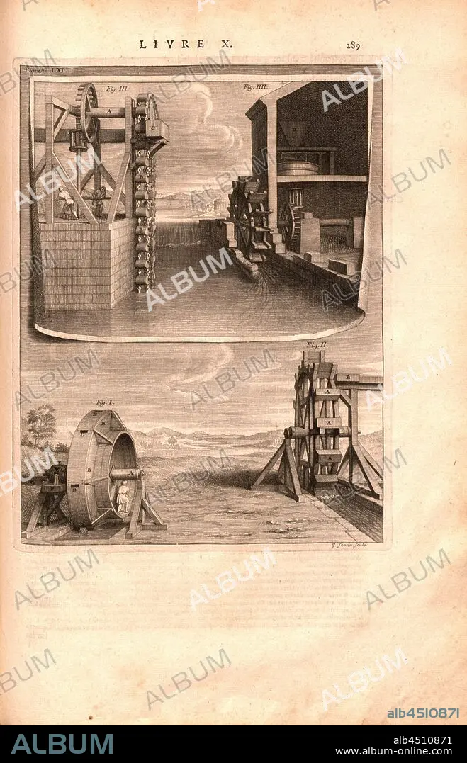 Four water lifting devices, Illustration of four different types of water elevators from the 17th century, signed: G. Scotin Sculp, Planche LXI, p. 289, Scotin, G. (sculp.), 1673, Pollio Vitruvius: Les dix livres d'architecture de Vitruve: corrigez et traduits nouvellement en françois, avec des notes & des figures. A Paris: chez Jean Baptiste Coignard, [...], 1673