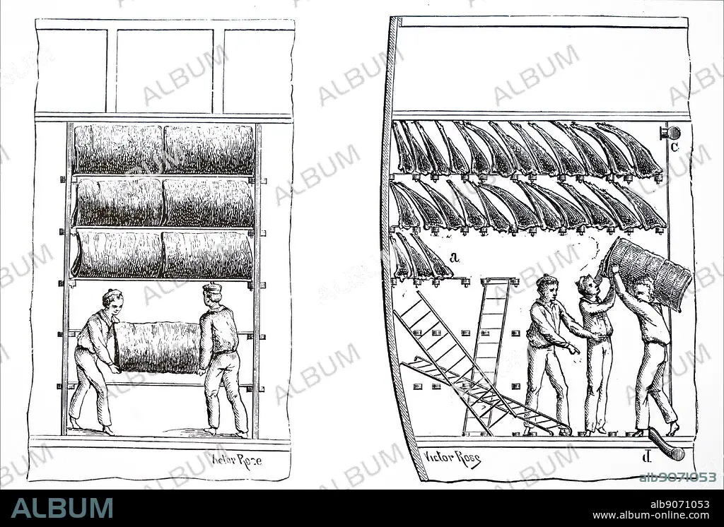 Cross-section of holds of a refrigerated ship, showing men handling sides of meat planned by Charles Tellier (1828-1913) a French engineer. Dated 19th century