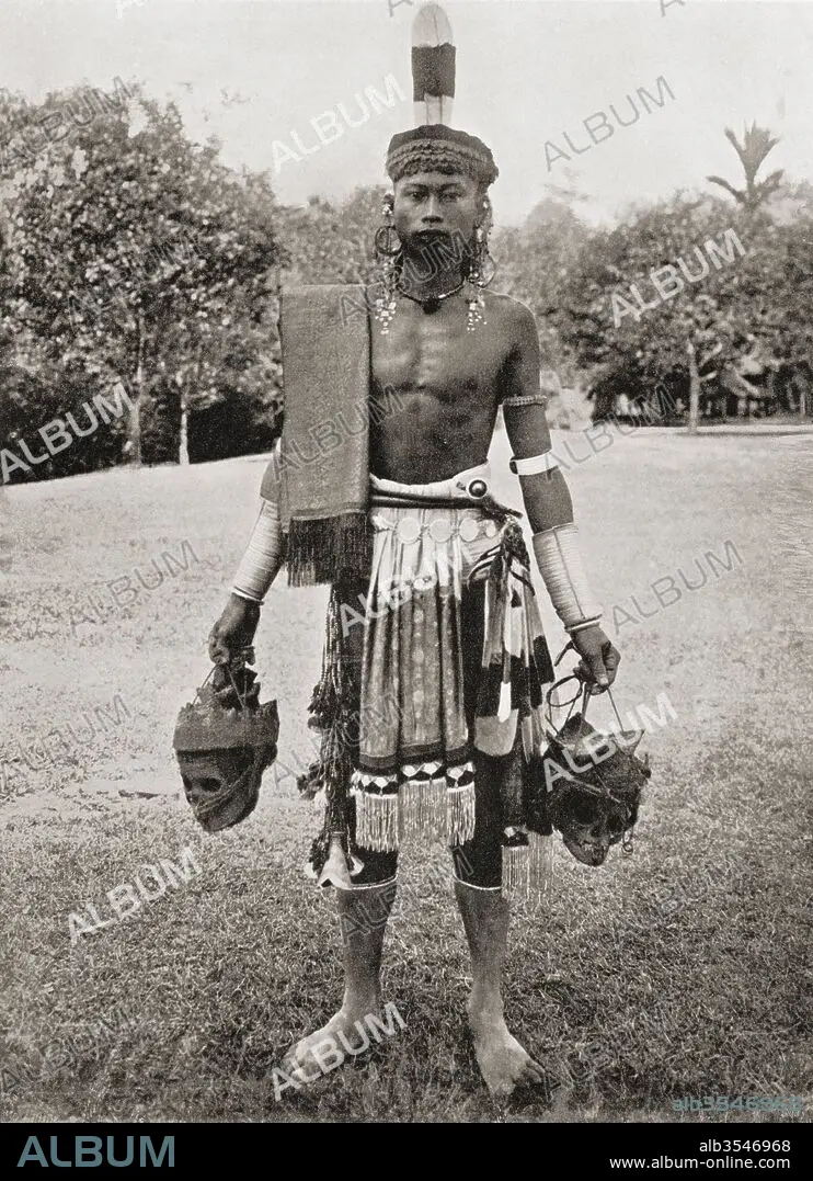 Title: A Dayak, Dyak or Dayuh man from the island of Borneo, seen here in gala costume