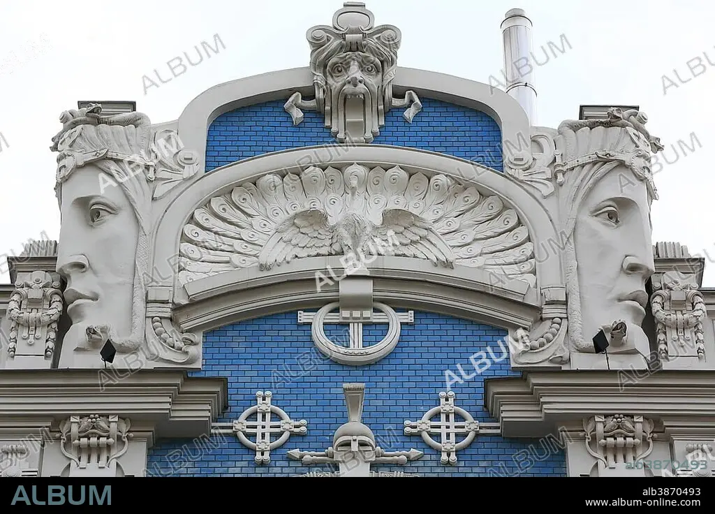 Art Nouveau facade of the house Eliza iela 10b or Elizabeth Street 10b, architect Mikhail Eisenstein, Riga, Latvia, Europe.