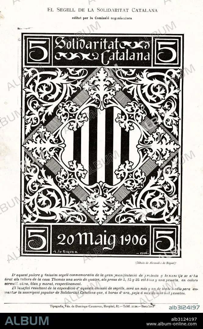 Sello de la Solidaritat Catalana conmemorativo de la manifestación de protesta, Barcelona 20 mayo 1906. Dibujo de Alexandre de Riquer.