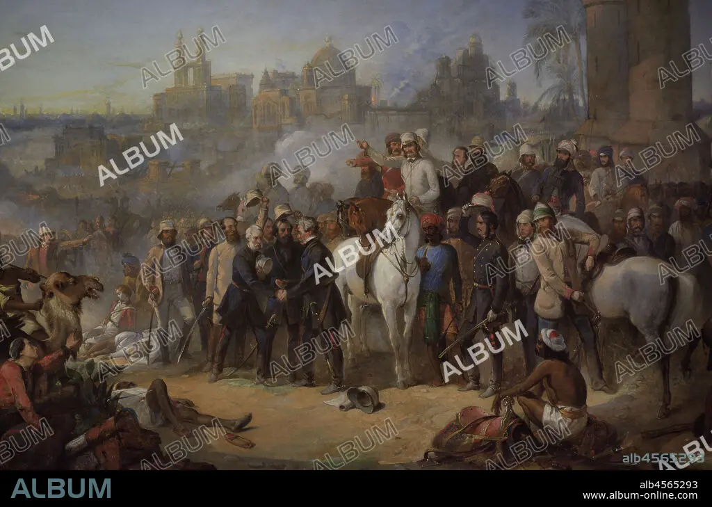 Caption: British Empire. Asia. Indian Mutiny, 1857. The Relief of Lucknow. Three central figures depict, from left to right: Sir Henry Havelock (1795-1857), Sir James Outram (1803-1863) and Sir Colin Campbell, Baron Clyde (1792-1863). Painting by Thomas Jones Barker (1815-1882). Oil on canvas (105,4 x 181,3 cm), 1859. Detail. National Portrait Gallery. London, England, United Kingdom.