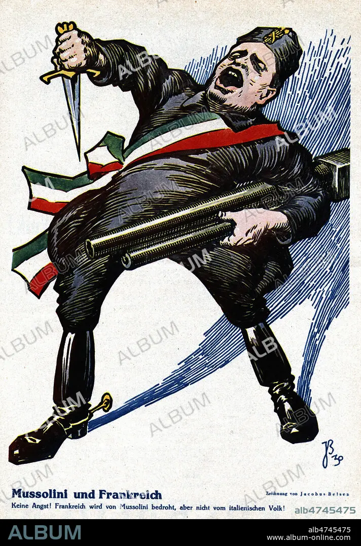 (MUSSOLINI et la France. La France est menacee par Benito MUSSOLINI (1883-1945) et pas par le peuple italien. Illustration Caricature de Jacobus BELSEN ( 1870-1937) pour Der Wahre Jacob du 30 aout 1930. Credit : Coll. Dixmier/KHARBINE-TAPABOR.