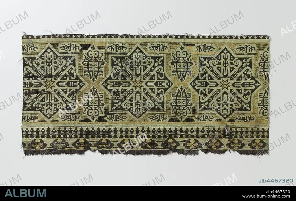 Caption: Fragment of samite with star patterns and Kufic script, Fragment of a fabric of silk with black warp threads and with black, green and yellow weft threads forming a border ornament of black, placed next to each other on yellow ground on yellow ground outlined 16 corners. Herein a star-shaped ornament of intersecting cuff characters and a yellow star as heart decoration. Along the sides of the 16 corners are small light green boxes with black characters. Edge decoration in black, green and yellow., anonymous, Persia, 1600 - 1799, silk, samite, h 57.6 cm × w 28 cm w 1.4 cm