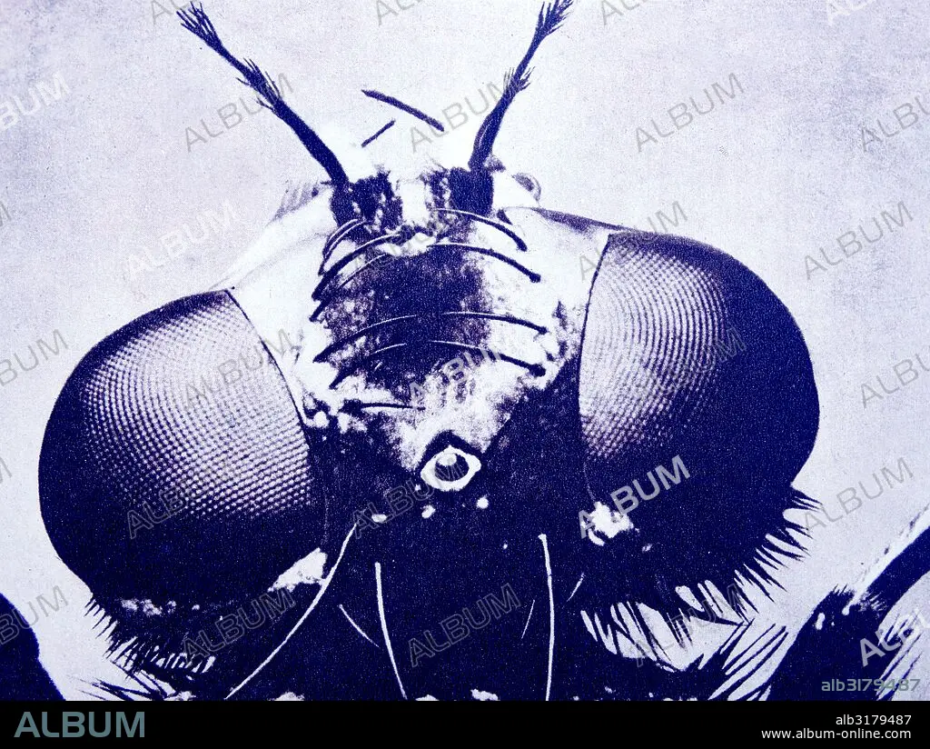 Caption: magnified head of house fly showing antennae and large compound eyes