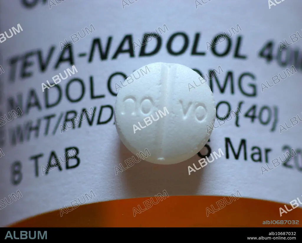 Caption: Nadolol, 40 mg tablets, 9 mm in diameter. This is a non-selective beta blocker used in the treatment of high blood pressure, migraine headaches, and chest pain. Physicians may suggest to break the tablets into quarters, i.e., 10 mg each, or halves (20 mg each).