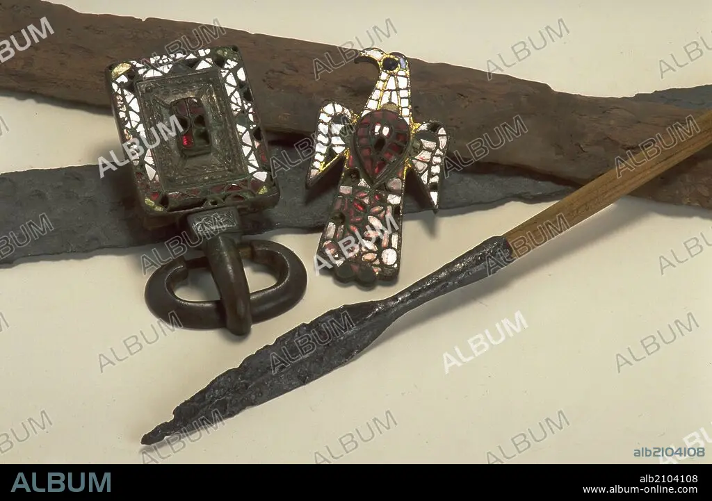 CONJUNTO DE AJUAR MASCULINO: LANZA FIBULA AQUILIFORME. DETALLE. VISIGODO. (DEPOSITO: MUSEO ARQUEOLOGICO NACIONAL)