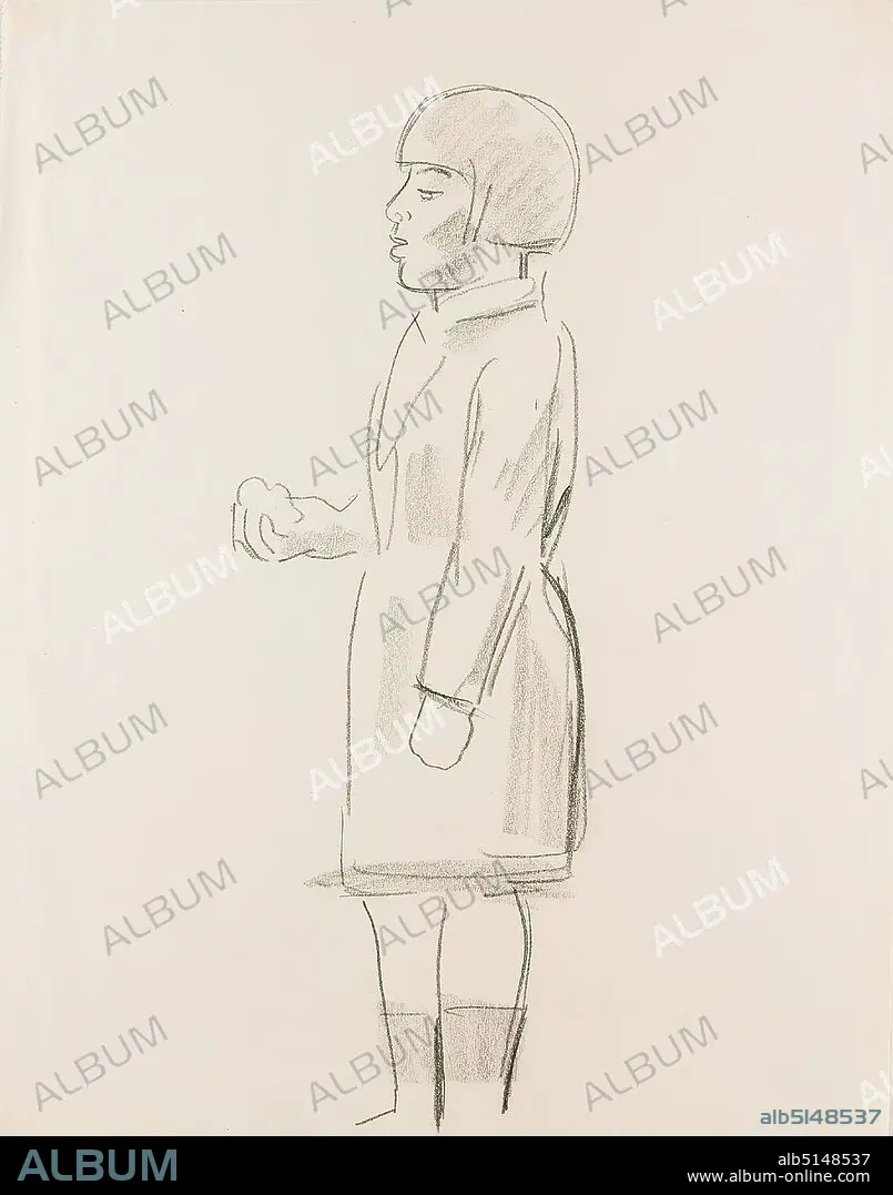 Gustav Heinrich Wolff, standing in profile (garlic seller?), drawing paper, drawing charcoal, drawing, charcoal on drawing paper, total (slightly trimmed lower right? ): Height: 33.3 cm; Width: 26.7 cm, drawing, graphics, Sketches, Standing Figure, Woman, Fashion, Clothing, Hairstyle Fashion, Hair Fashion, Market, Classic Modernism, Standing Woman with Pageboy Cut in Dress with Scarf and Holding Something in Her Right Hand, from the Sketchbook early 1928. Cf. similar sketch Inv.nr. EG1989.1.250, there inscribed: de lail! (garlic!).