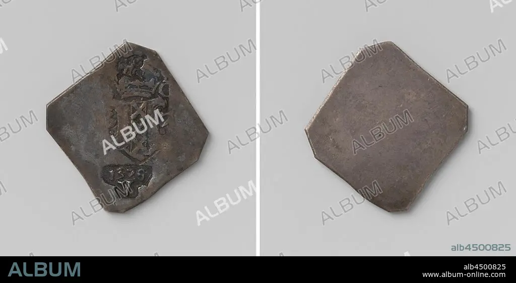 Caption: Siege of Amsterdam, emergency coin of five pennies minted from the silver of the Nieuwe Kerk, one-sided, diamond shaped emergency coin with beveled corners. Front: three stamps, from bottom to top: mint master's mark: flint steel, partially crossed over second stamp: city coat of arms: crowned coat of arms, left part of number 5, right of 7 visible, right of crown: number 0 visible, year above letter V. Reverse: blank, Amsterdam, anonymous, 1578 - 1631, silver (metal), striking (metalworking), h 3.2 cm × w 3.1 cm × w 3.53 gr