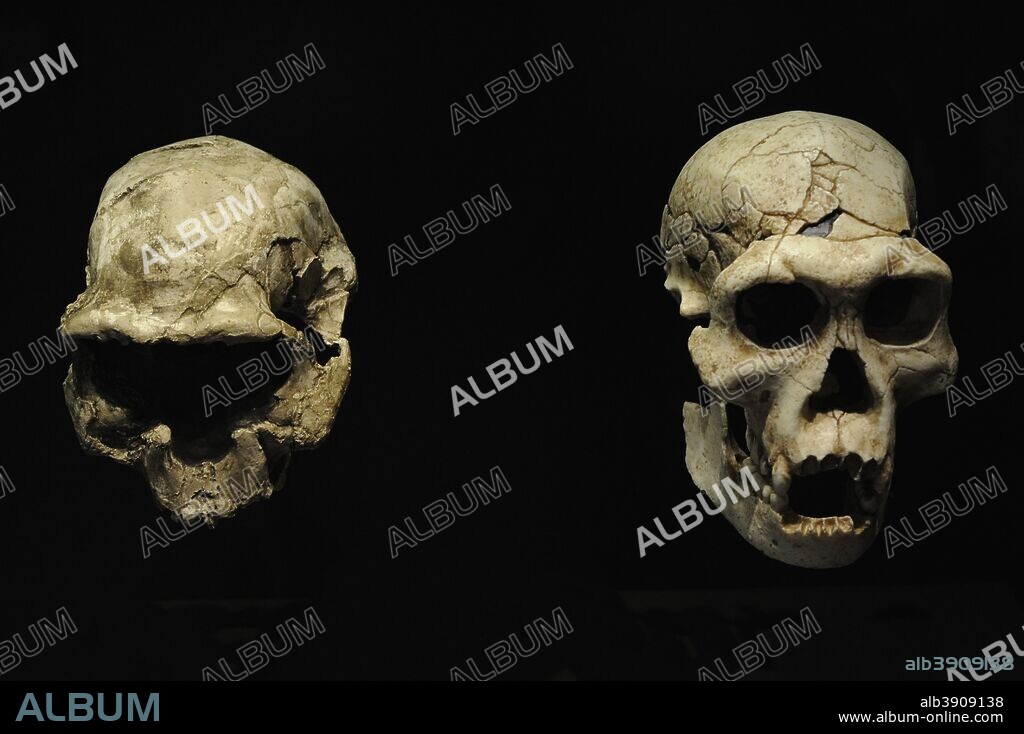 Homo georgicus. On the left, reproduction of the skull D2282 probably of a young woman. Cranial capacity, 650-660 cc; on the right, reproduction of the skull D2700 and the jaw D2735 corresponding to a male. Weight, 40-50 Kg. Size, 150 cm. Cranial capacity, 600-700 cc. 1.8 million years. Lower Pleistocene. Habitat, steppe forests. Found in Dmanisi (Georgia). National Archaeological Museum. Madrid. Spain.