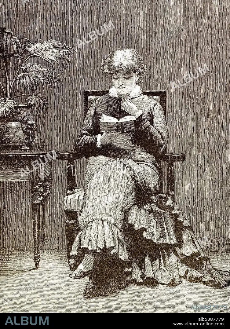 Historical drawing from England, 19th century, young woman sitting in an armchair and reading a book, around 1880