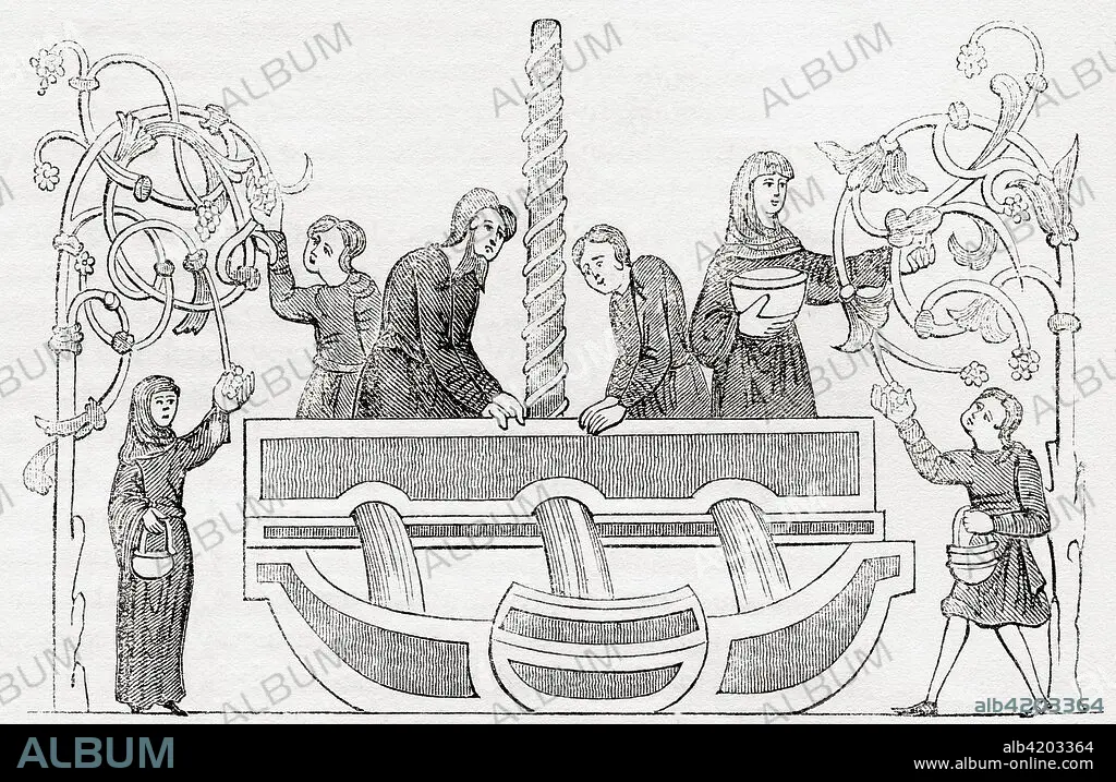 Caption: A medieval wine press, after a Cotton MS. The Cotton or Cottonian library is a collection of manuscripts once owned by Sir Robert Bruce Cotton (1571-1631), an antiquarian and bibliophile. From Old England: A Pictorial Museum, published 1847.From Old England: A Pictorial Museum, published 1847.
