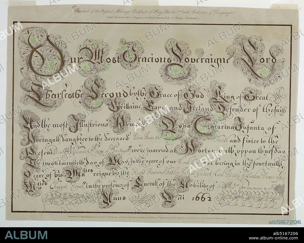 Caption: Facsimile of original marriage certificate of Charles II and Catherine of Portugal, Lithograph on paper, Facsimile of original marriage certificate of Charles II and Catherine of Portugal, Europe, 19th century, Print, Print