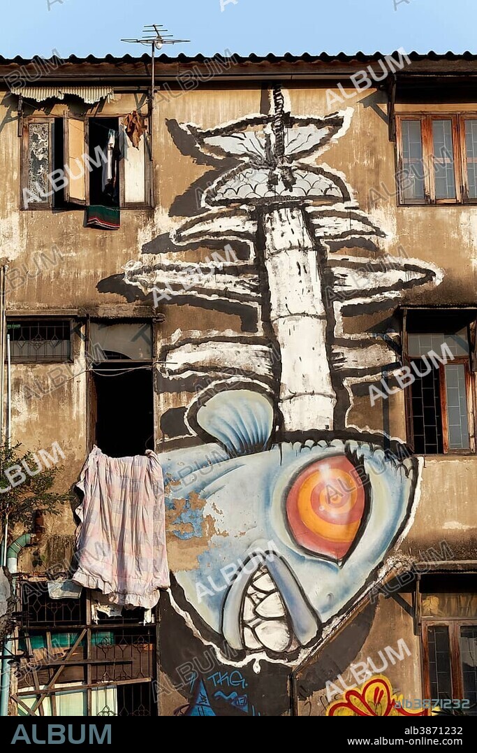 Fish Skeleton, Mural, Graffiti at a dilapidated house, Graffiti Park Si Surut Alley, Ratchathewi, Bangkok, Thailand, Asia.