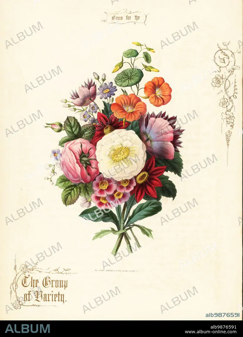 Caption: Bouquet of white rose, dahlia, nasturtium, auricula. The Group of Variety. Hand-coloured lithograph with gold calligraphy by Paul Jerrard from his own Gems for the Drawing Room, Paul Jerrard, 111 Fleet Street, London, 1852. Jerrard was a Victorian lithographer and print colourer active in London.
