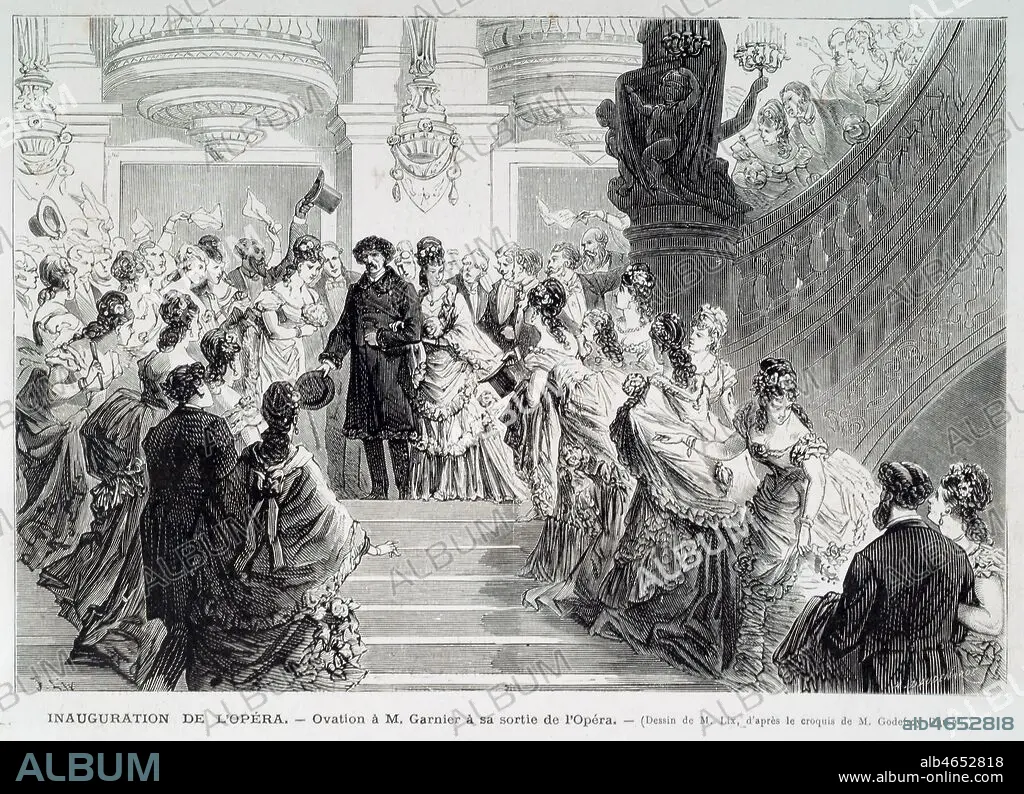 Inauguration de l'opera. Ovation a M. Charles Garnier (1825-1898) a sa sortie de l'Opera. Illustration de F. LIX (1830-1897) dans le monde illustre du 16/01/1875. Credit : Collection Kharbine-Tapabor.