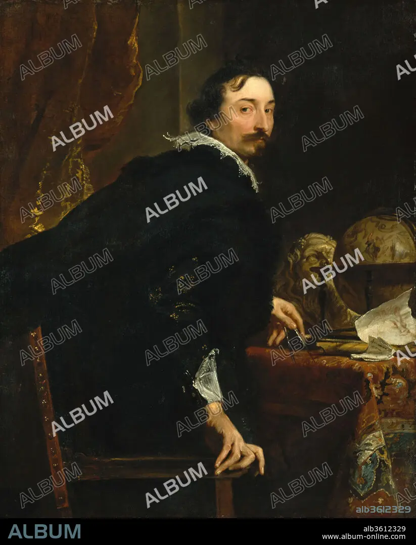 Van Uffel was a wealthy Flemish merchant who lived in Venice, where Van Dyck probably painted this portrait early in his Italian period (1621-27). In another portrait (Herzog Anton Ulrich-Museum, Brauschweig), Van Dyck shows the same sitter authoritatively posed before a view of ships sailing off a Mediterranean coast. Ours, by contrast, shows Van Uffel as a learned gentleman, with signs of his varied interests: dividers, a recorder, the bow of a viola da gamba, an antique head, a drawing, and a celestial globe.
