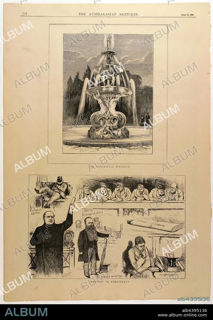 Newspaper Cutting - 'The Exhibition Fountain', The Australasian Sketcher, Adelaide, 19 Jun 1880, Extracts of The Australian Sketcher, no.99, vol. VIII, Adelaide edition, Saturday 19 June 1880, pp. 114-16, 125-28, published by G.N. & W.H. Birks, Adelaide. Page 116 depicts two black & white wood block illustrations: the top image shows the fountain at the southern entrance to the Melbourne Exhibition Buildings; the lower image is captioned 'Sketches in Parliament'. The fountain was designed