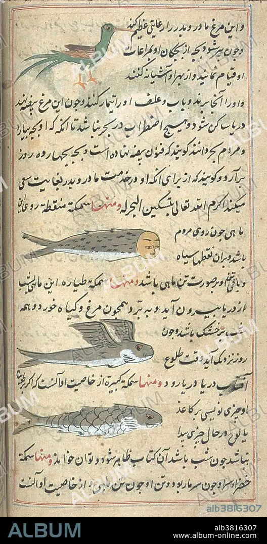 Four mythical creatures: A long-tailed green bird, a human-headed fish, a flying fish, and a large fish. From 'Aja'ib al-makhluqat wa-ghara'ib al-mawjudat (Marvels of Things Created and Miraculous Aspects of Things Existing) by Abu Yahya Zakariya' ibn Muhammad al-Qazwini (1203-1283) an Arab physician, astronomer, geographer and proto-science fiction writer. Neither the copyist nor illustrator is named, and the copy is undated. The nature of paper, script, ink, and illustrations suggests that it was produced in western India in the 18th century.