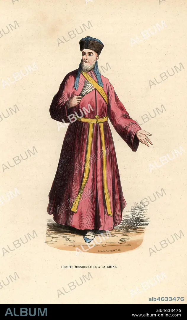 Caption: Missionary of the Society of Jesus in China. Jesuite Missionnaire a la Chine. Handcoloured woodblock engraving by L. Maerraert after an illustration by Jacques Charles Bar from Abbot Tirons Histoire et Costumes des Ordres Religieux, Librairie Historique-Artistique, Brussels, 1845.