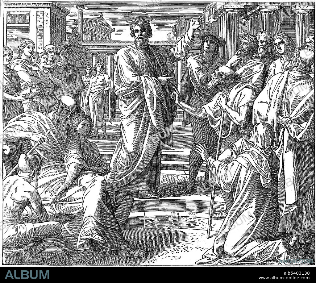 Woodcut, Paul with the wise men of Athens, Acts of the Apostles, Gospel of Luke, 17, 22;23, New Testament, Catholic Picture-Bible
