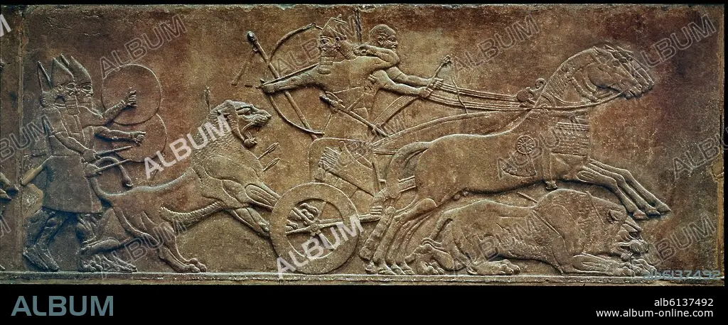 Caption: Assurbanipal hunting lions. Relief discovered in Ninive, capital of the Assyrian empire, known today as Tell Kouyoundjik and Tell Nebi Younous in Irak. 650 B.C.. London, British Museum