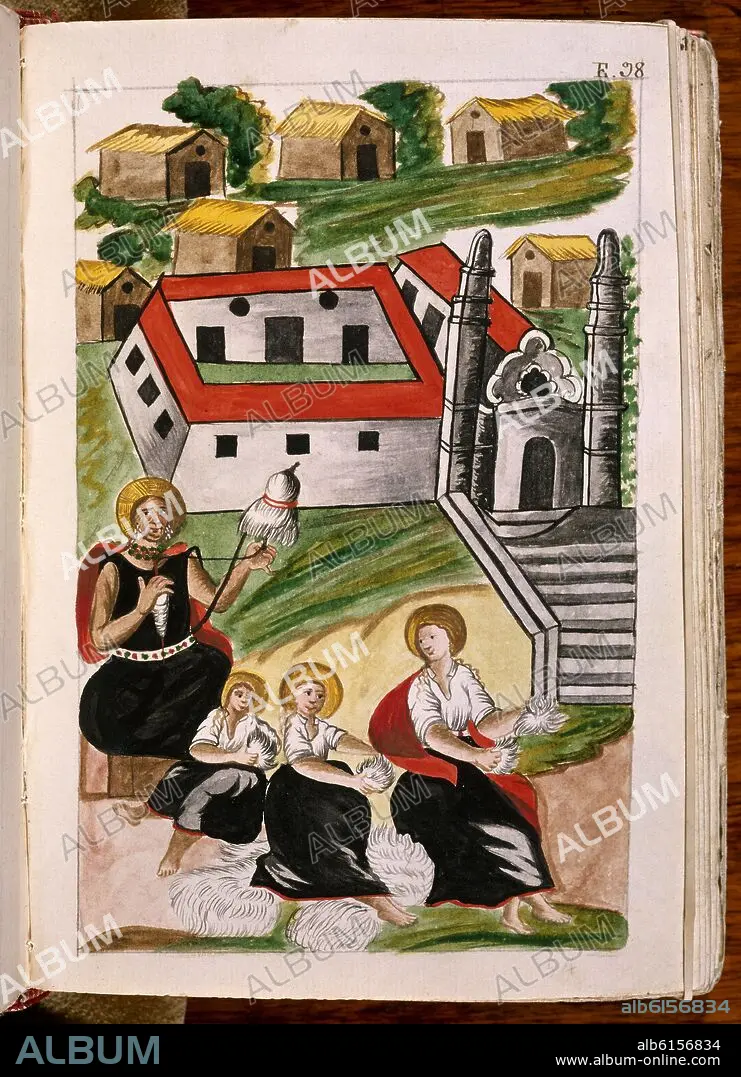 BALTASAR JAIME MARTÍNEZ COMPAÑÓN. CODICE TRUJILLO DEL PERU - TOMO II E 98 - INDIAS ESCARDANDO LANA - ACUARELA - SIGLO XVIII