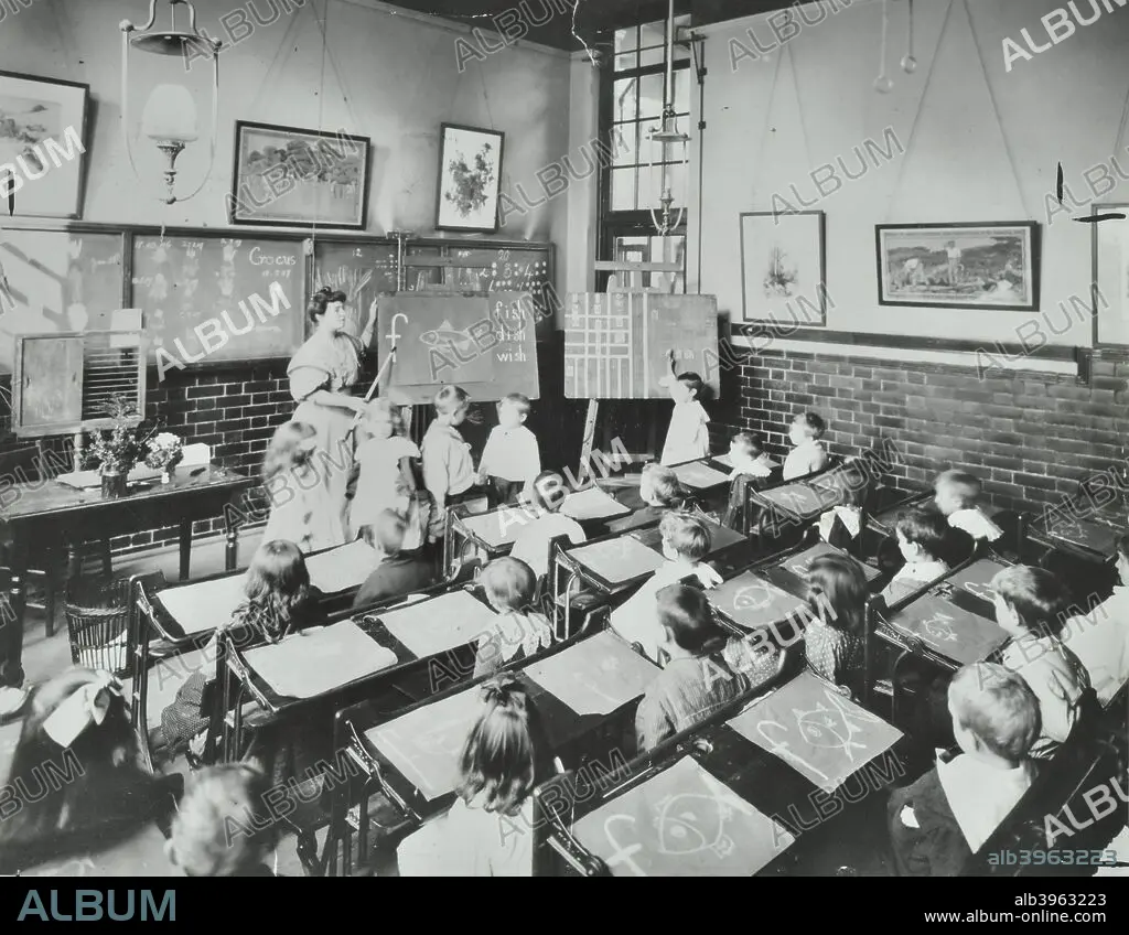 Caption: Spelling lesson, Southfields Infants' School, Wandsworth, London, 1907. Children are being taught the formation of the word 'fish' by a teacher. The children all have pictures they have drawn of fish on their desks in front of them. A boy at the front of the class has his hand raised to ask a question.