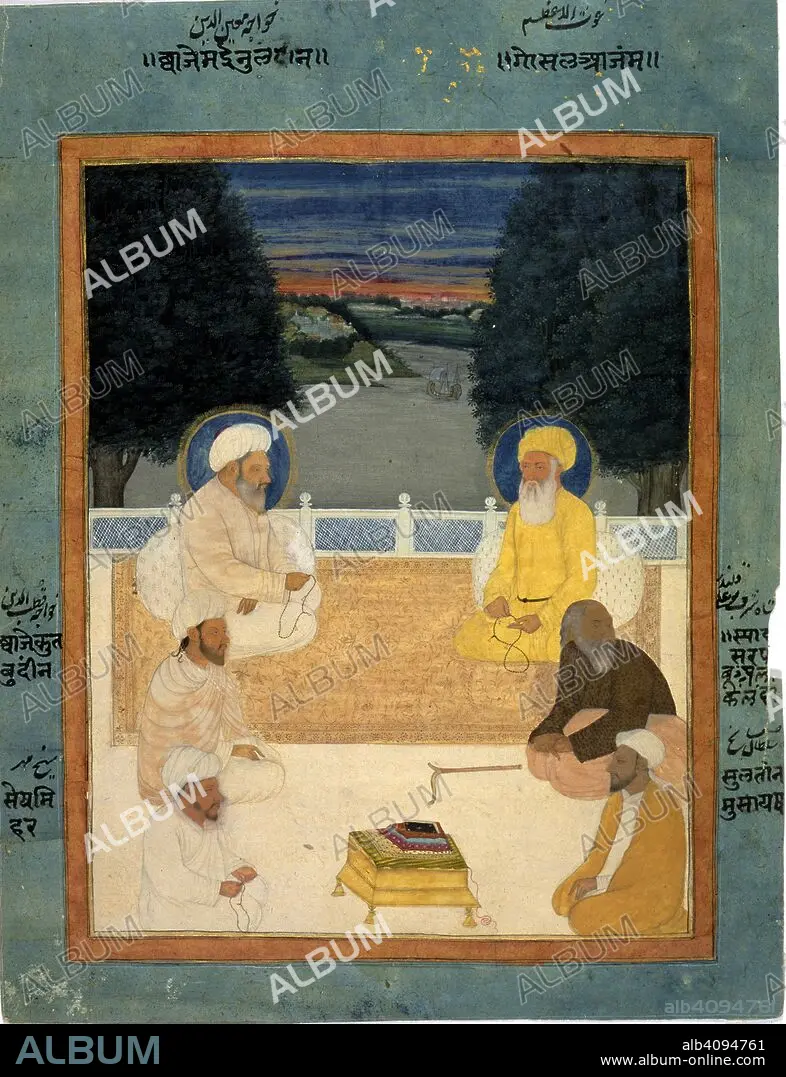 Caption: Sufi saints. c.1760. Six Sufi saints seated on a terrace; Khvaja Mu'in al-Din, Ghaus al-A'zam, Khvaja Qutb al-Din, Shaikh Mihr, Shah Sharaf Bu 'Ali Qalandar and Sultan Musa Shaikh. Opaque watercolour and gold. Originally published/produced in c.1760. . Source: Add.Or.4473,.