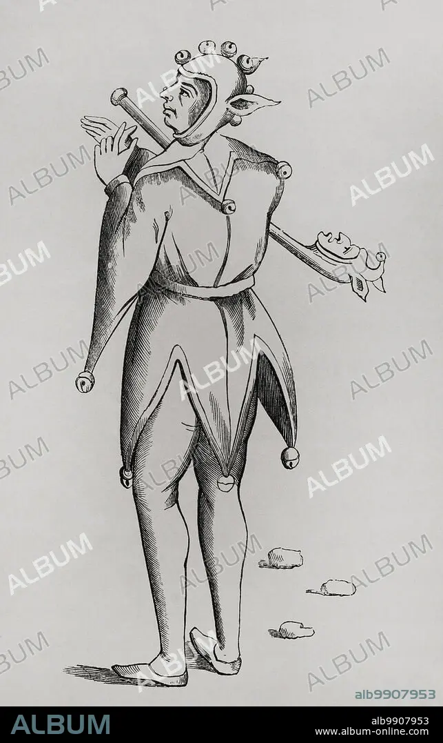Caption: Buffoon holding a puppet beneath his arm. Engraving based on a miniature from a 15th-century manuscript. Sciences & Lettres au Moyen Age et à l'époque de la Renaissance. Paris, 1877.