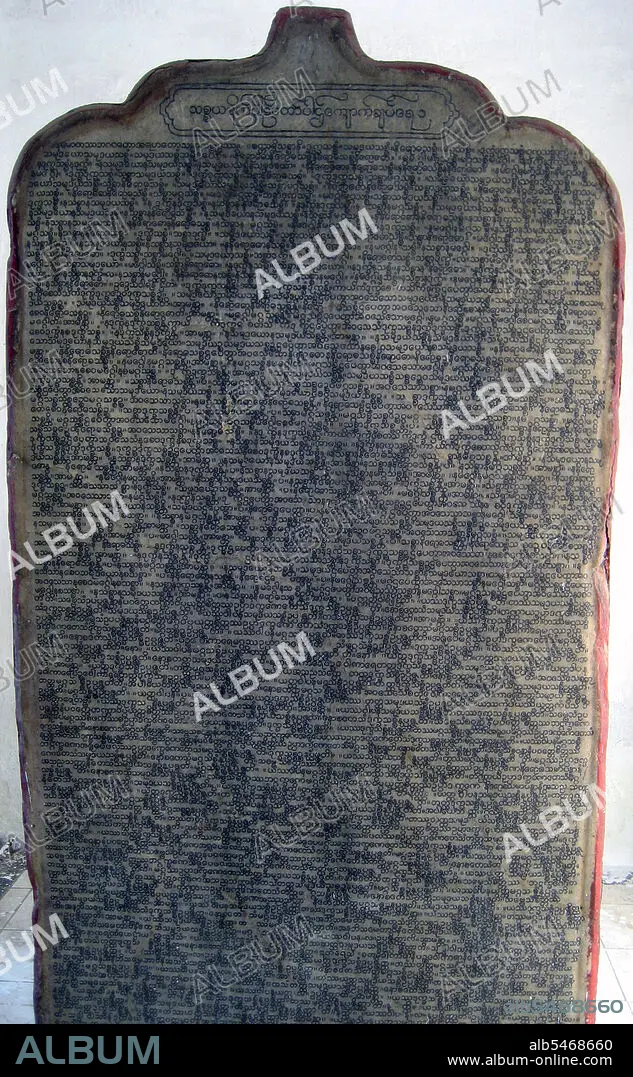 Caption: Inscribed stone or kyauksa at the Kuthodaw Pagoda, Mandalay, Myanmar. The entire Tipitaka Pali canon of Theravada Buddhism is set on 729 marble slabs, each with 80 to 100 lines of text, originally in gold ink, on both the obverse and the reverse sides. Each stone is three and a half feet wide, five feet tall and five inches thick and housed in a kyauksa gu or a small cave-like stupa.