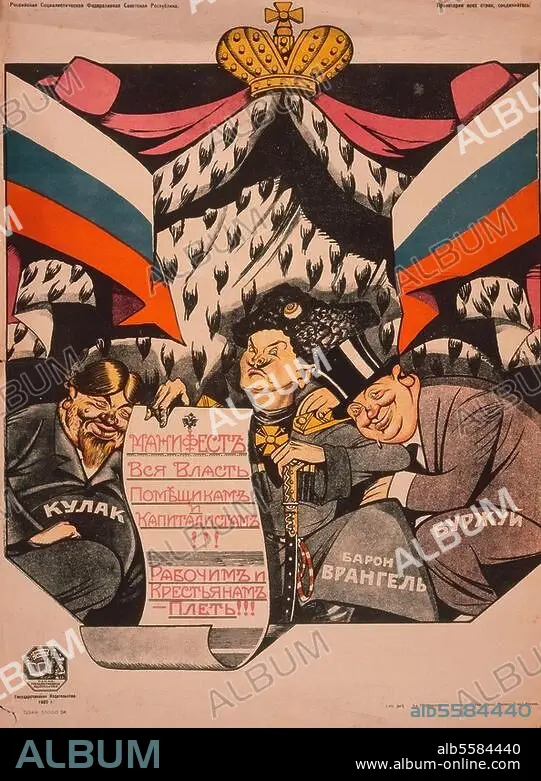 Caption: Soviet Republic / Civil War 1918-21. - "Manifesto: All power to the landowners and the Capitalists!!! The whip to the pesants and workers!!!". (Caricature of the "Ruling class" in Russia.). Poster, 1920.