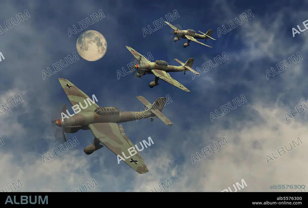 A formation of German Ju 87 Stuka dive bombers preparing to attack enemy targets during World War II.