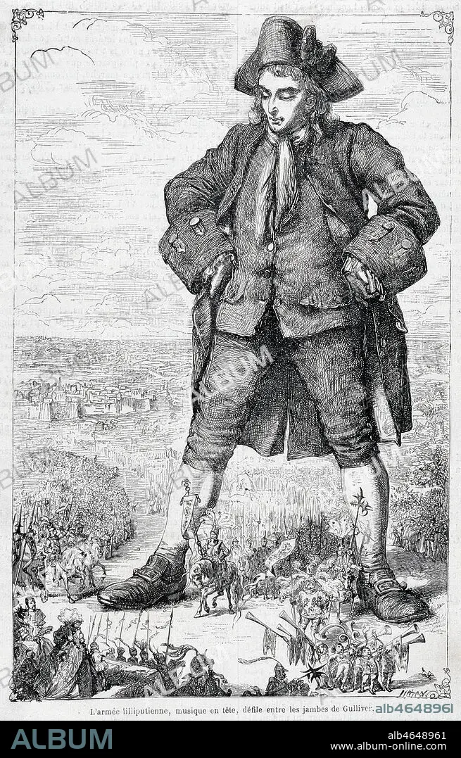 'L'armee liliputienne, musique en tete, defile entre les jambes de Gulliver'. Oeuvre de SWIFT (1667-1745) publiee dans La Semaine des enfants en 1867. Illustration par Thomas MORTEN. Credit : Collection Jonas/KHARBINE-TAPABOR.