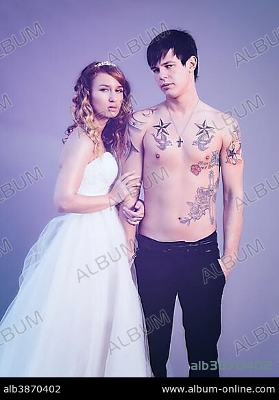 Wedding picture, bride and groom, bare chested groom with tattoos