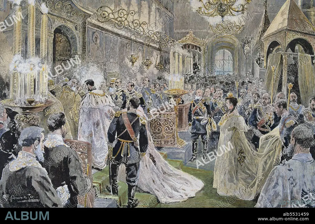 Automatic translation: NICOLAS II. TSAR OF RUSSIA. 1868 - 1918. CORONATION OF THE TSAR IN THE CATHEDRAL OF THE ASSUMPTION IN MOSCOW, 1896. COLORED ENGRAVING. SPANISH AND AMERICAN ILLUSTRATION