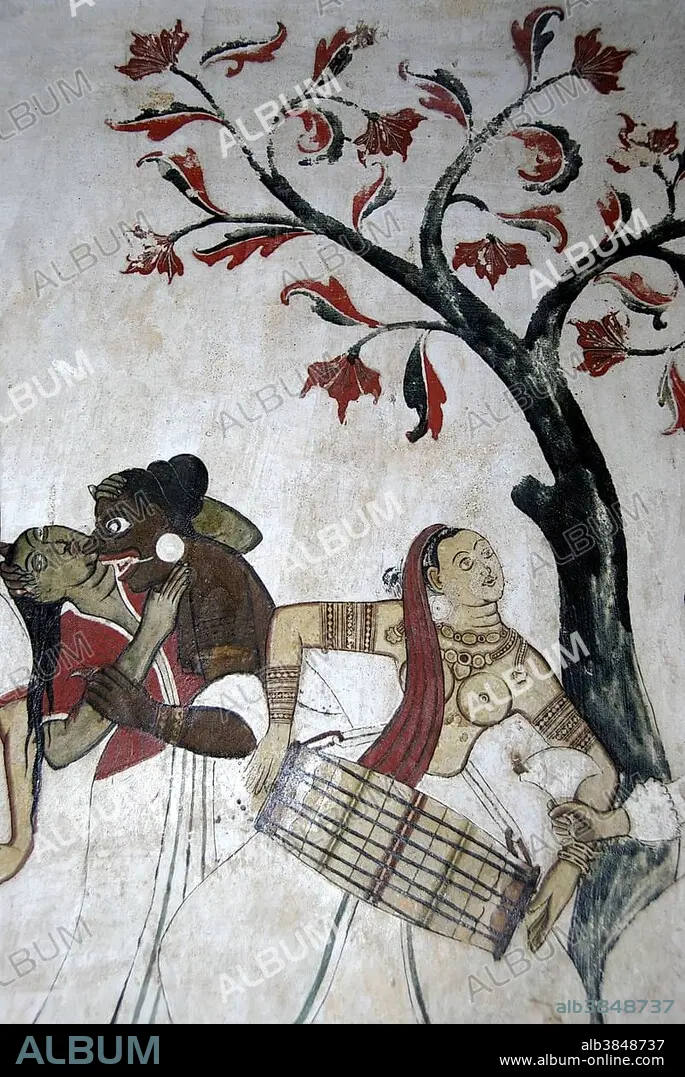 Caption: Buddhism, ancient wall painting, bare-breasted woman playing tabla drum, Mulgirigala Temple, Mulkirigala, Ceylon, Sri Lanka, South Asia, Asia