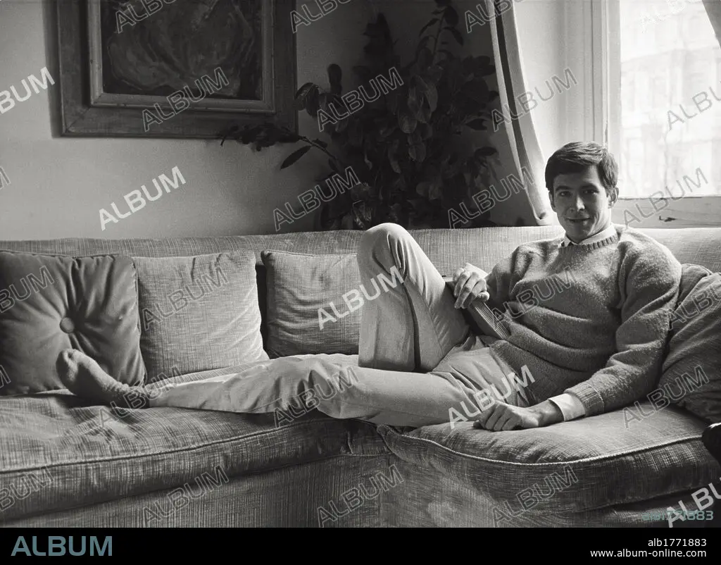 The American actor Anthony Perkins smiling lying down on a couch. 1960s