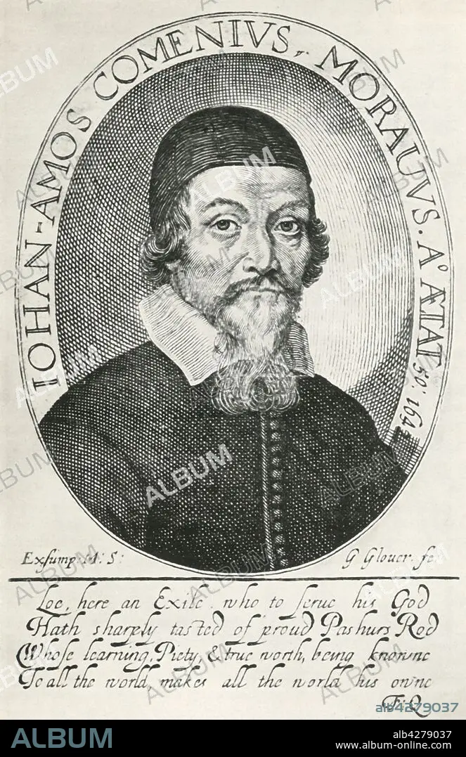 Caption: 'Comenius', 1642, (1947). Portrait of John Amos Comenius (1592-1670), Czech teacher, writer, philosopher and theologian, aged 50. 'Loe, here an Exile; who to serve his God, Hath sharply tasted of proud Pashurs Rod, Whose learning, Piety, & true worth being knowne To all the world, makes all the world his owne'. Comenius introduced innovative educational concepts such as pictorial textbooks written in native languages (instead of Latin), lifelong learning with a focus on logical thinking (over mechical memorization), and access to education for women and poor children. From "History of Czechoslovakia in Outline" by J. V. Polisensky. [Sphinx Publishers Ltd, Prague, 1947]