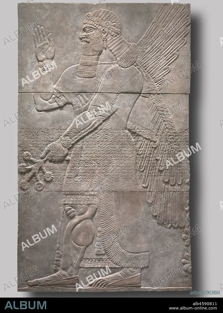 Saluting Protective Spirit, 883-859 BC. Assyrian kings ruled the world's largest empire prior to the rise of Persia in the 6th century bc, consolidating lands from Iran to Egypt. In 879 bc the Assyrian king Ashurnasirpal II began building his new royal residence at Nimrud. Originally brightly painted, this is one of some 300 reliefs that decorated the palace. Masterfully executed with incised details and exaggerated musculature, this giant, fierce, protective spirit raises his right hand in a ritual salute. His left hand grasps a branch bearing rosettes, perhaps a stylized date palm. Across the center of the relief are inscribed lines of Akkadian cuneiform recounting military victories, conquests, plundered loot, and the reconstruction of the city. Destroyed in 612 bc, the palace lay buried for 24 centuries until rediscovered in 1845.