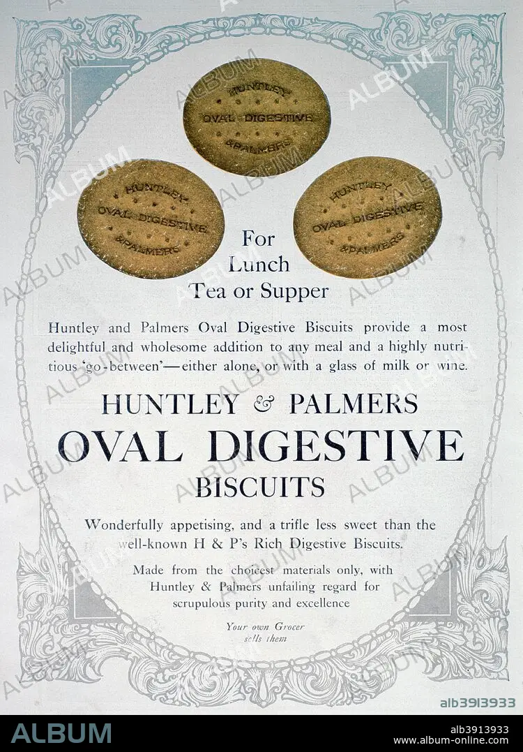 Advert for Huntley and Palmers Oval Digestive Biscuits, 1909. A print from The Illustrated London News, 26th June 1909. Rights information: Cleared for Editorial Use Only. Please Contact Us For Any Other Clearance Rights
