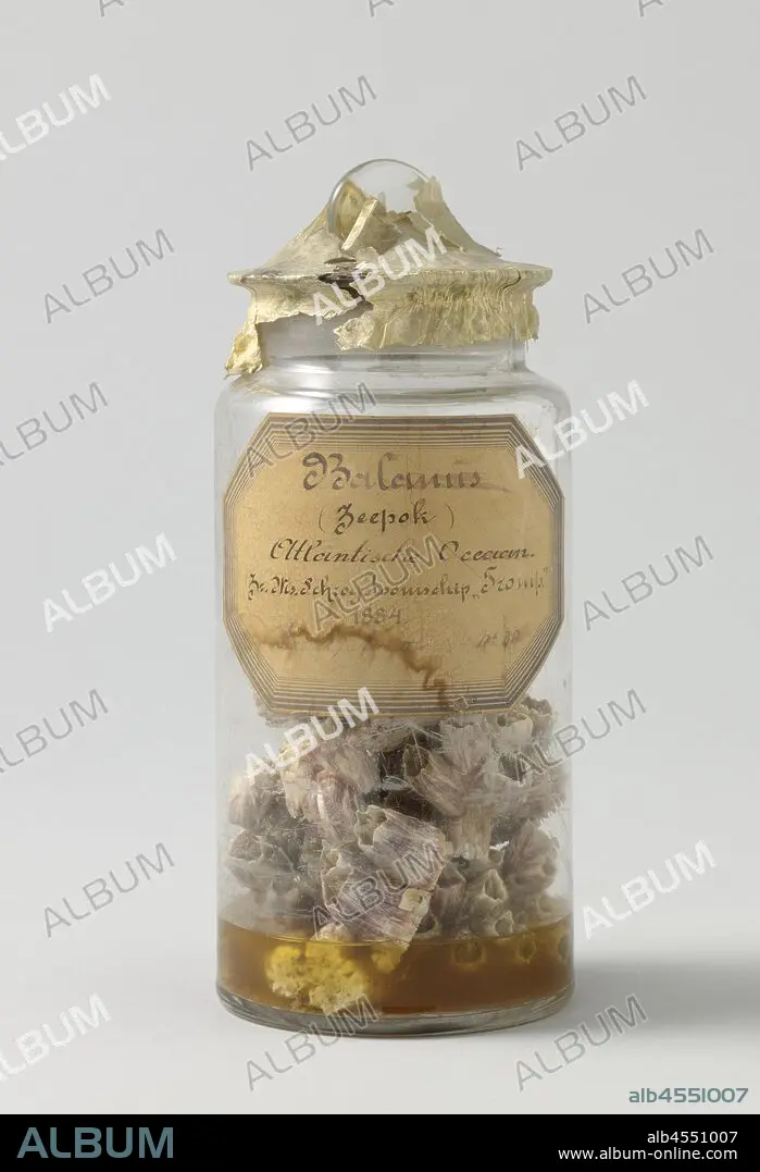 Caption: Glass Jar with Barnacles, Sample of barnacles (Balanus spec.) In glass jar with lid, sealed with animal bladder and wax, Atlantic Ocean, Tromp (ship), barnacle (animal), anonymous, 1884, glass, water, organic material, wax, paper, h 28 cm × d 12 cm