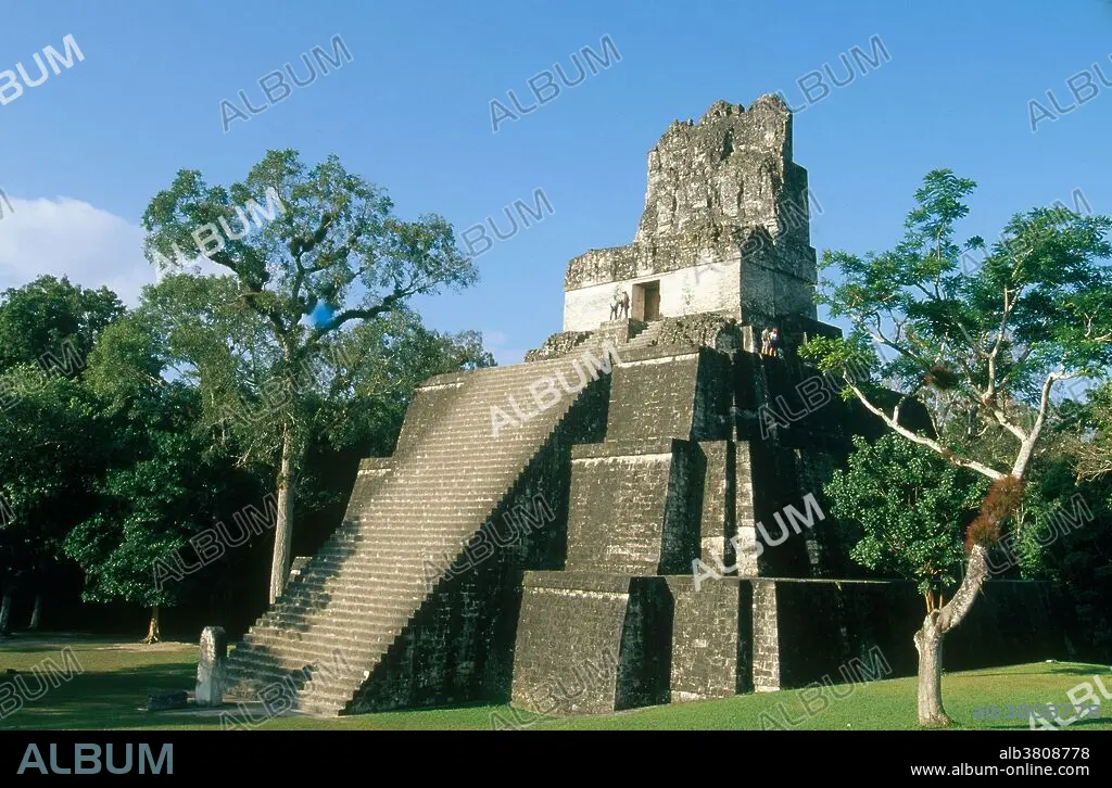 Caption: The ancient Mayan city of Tikal in Guatemala, which reached its height in the years 200 to 900 AD. Shown here is Temple 2 at Great Plaza (Plaza Mayor).