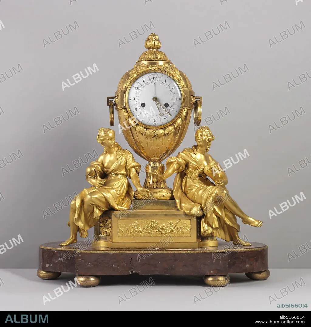 Caption: Mantel clock, Gilt bronze, marble, Large bronze clock; center part made up of large vase with round ring handles; acanthus and laurel leaves. Dial painted with small flowers on white enamel. On each side of the vase is a female figure; one holding a terrestrial glob (Geography), the other holding a scroll (Literature). The plinth on which the two figures are seated is decorated with chiseled plaques in front showing cupids and decorative motifs. The clock sits on a large red marble stand., France, ca. 1775, timepieces & measuring devices, Decorative Arts, Mantel clock