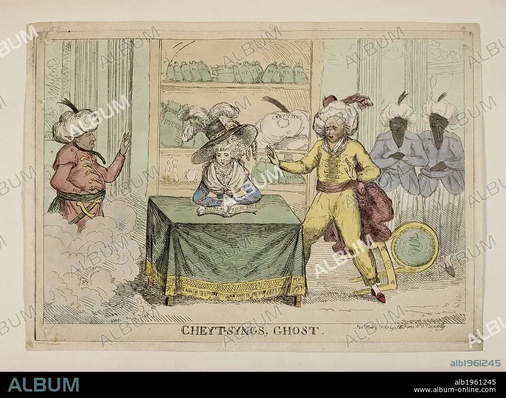 Cheyt-Syngs' Ghost. This hand-coloured engraving depicts a woman, possibly Queen Charlotte, reading a book inscribed 'The State of India'. She sits in front of a cupboard stacked with bags of money. Warren Hastings, on the right, stands transfixed in horror at the apparition of Chait Singh, the Raja of Benares, who had rebelled against Hastings' land taxes. The artist, who depicts Chait Singh wearing a noose, appears to have confused him with Nanda Kumar, another key figure in Hastings' impeachment, who had been hanged for forgery in 1775. Published :1788 . Source: P3329.